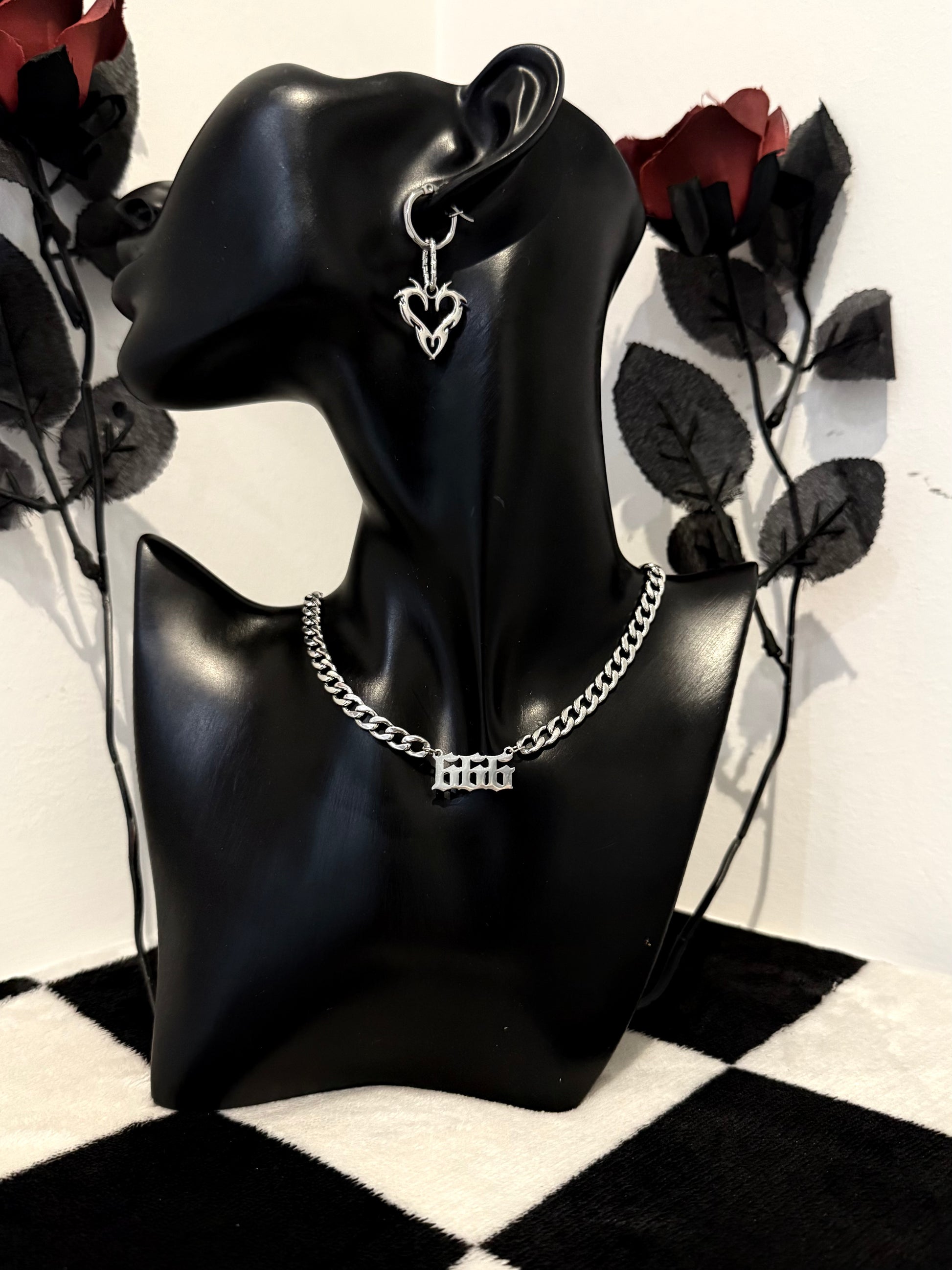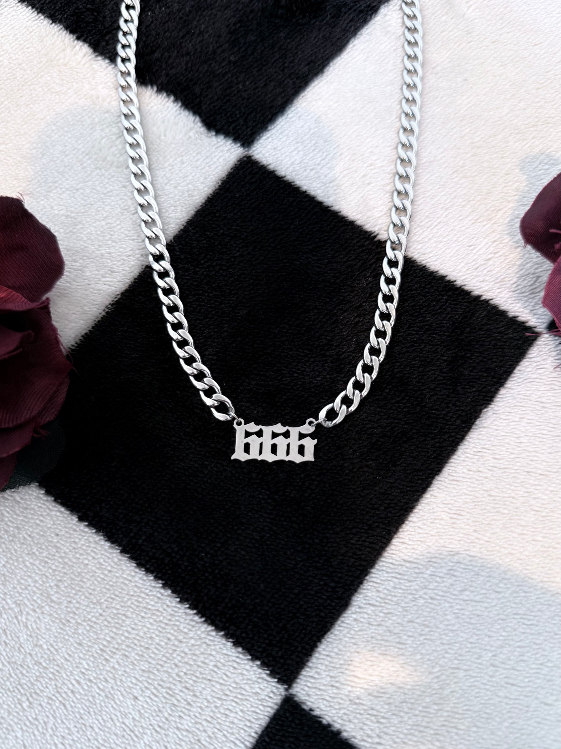 The 666 Necklace features a stainless steel curb chain paired with a bold stainless steel 666 pendant. Clean, heavy, and unapologetic, this piece delivers a dark edge with durable construction.