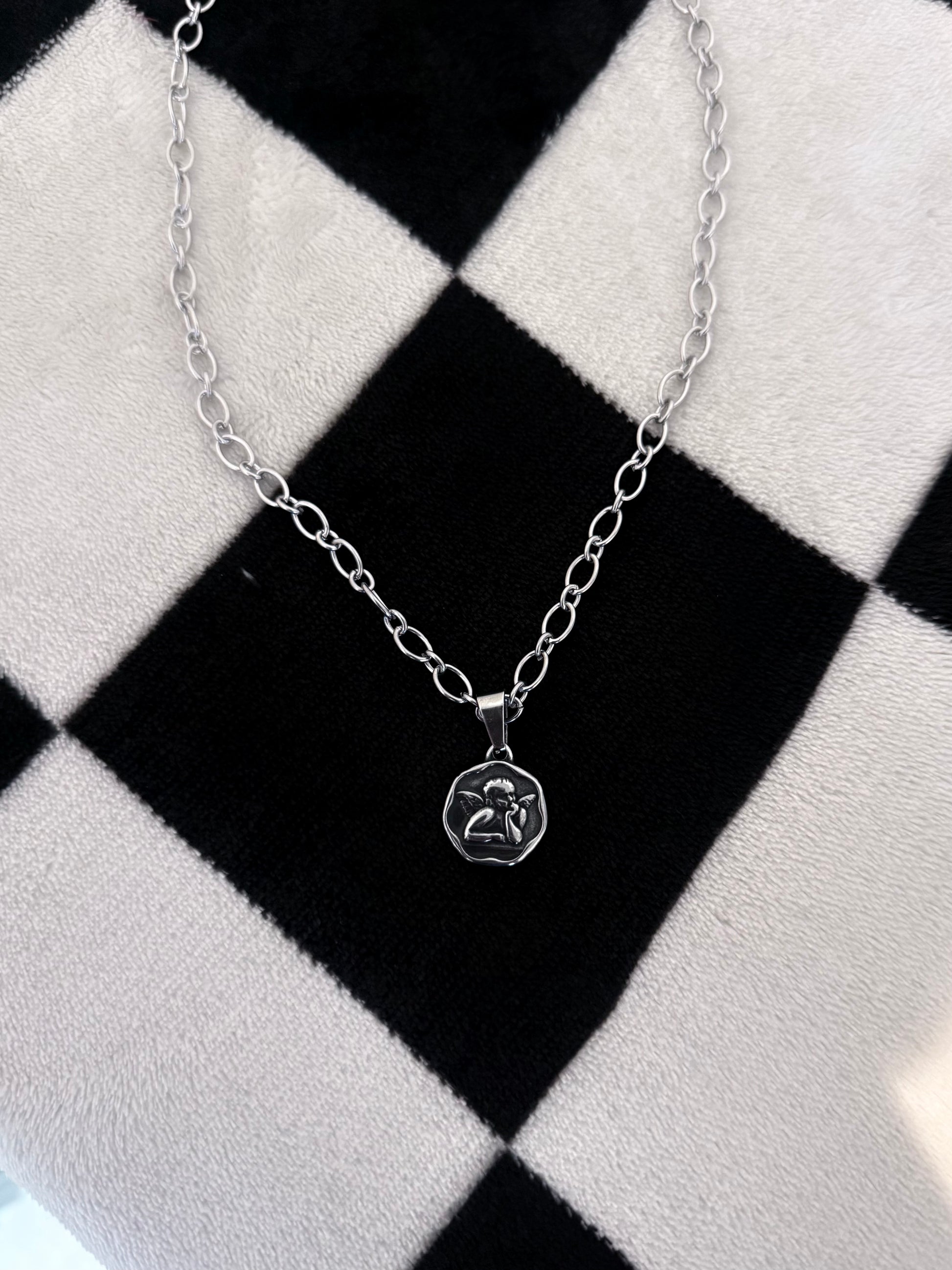 Stainless steel chain featuring a dime pendant engraved with Cupid. Minimal, edgy, and timeless.