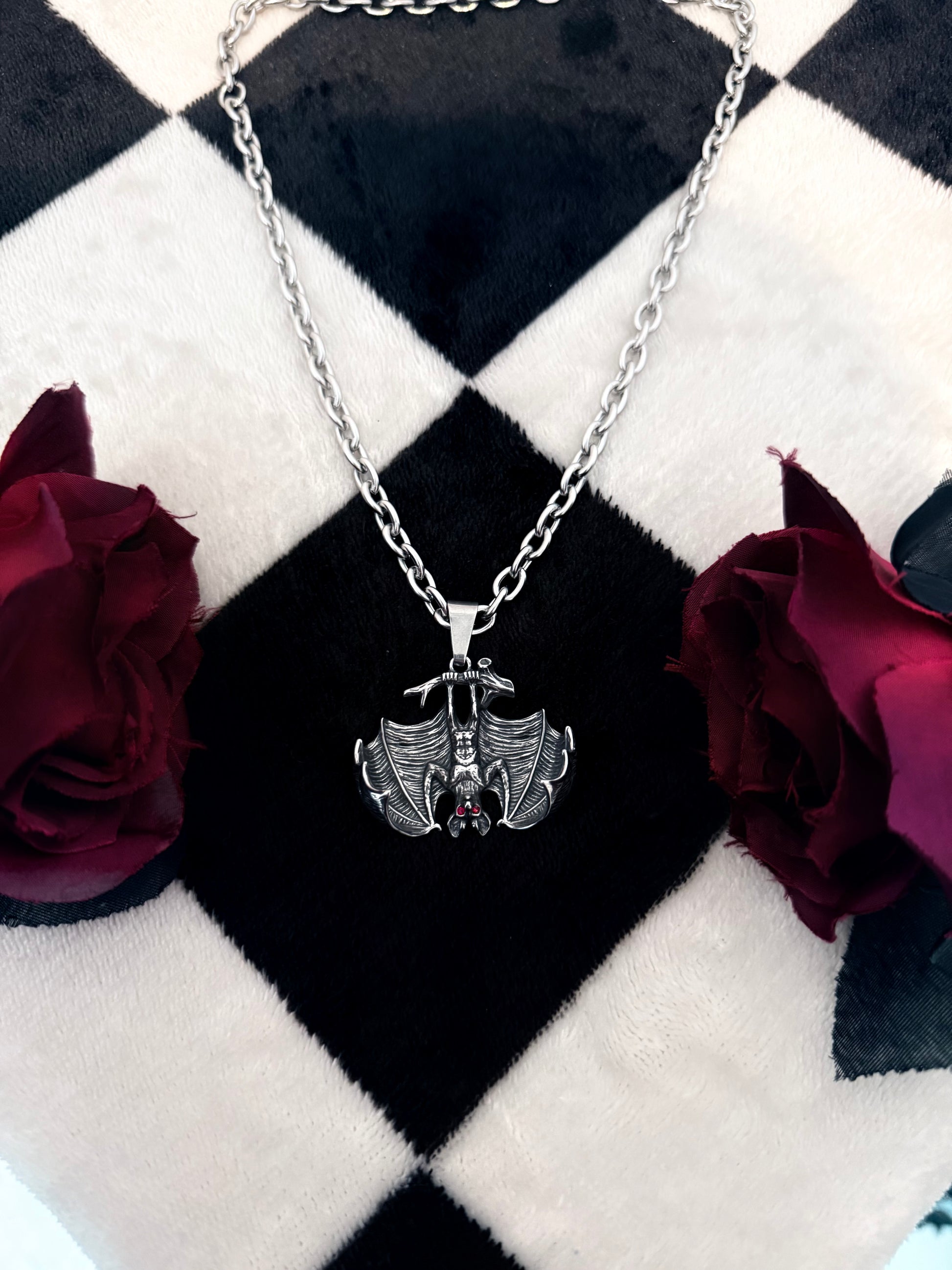 the dark elegance of the Fallen Necklace. Featuring a stainless steel hanging bat pendant on a sleek stainless steel chain, this piece captures gothic charm with a modern, minimalist edge.
