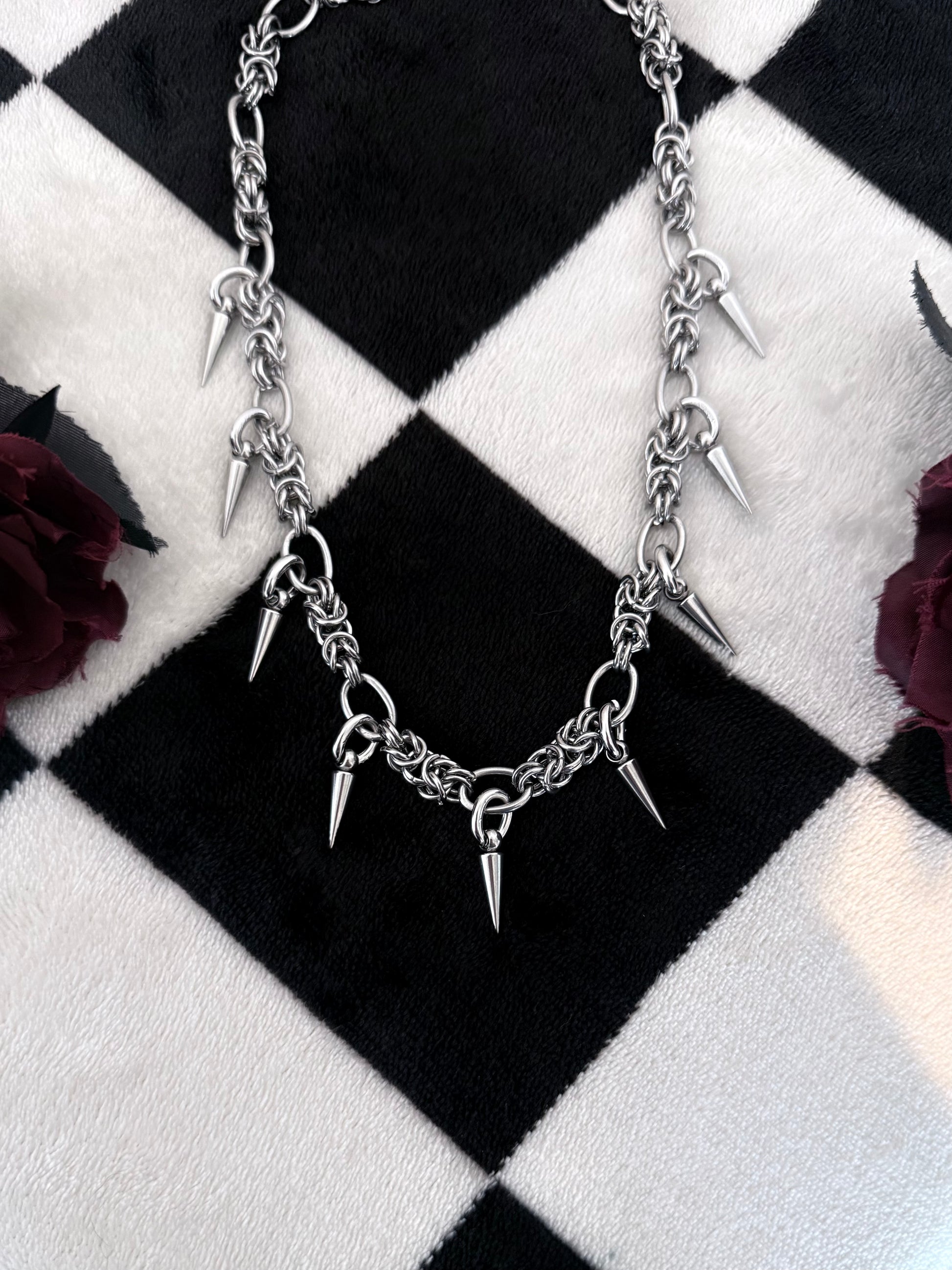 A bold, minimalist statement piece. This halo necklace features a durable stainless steel chain accented with nine sleek stainless steel spike charms, designed to add edge and shine to any look.