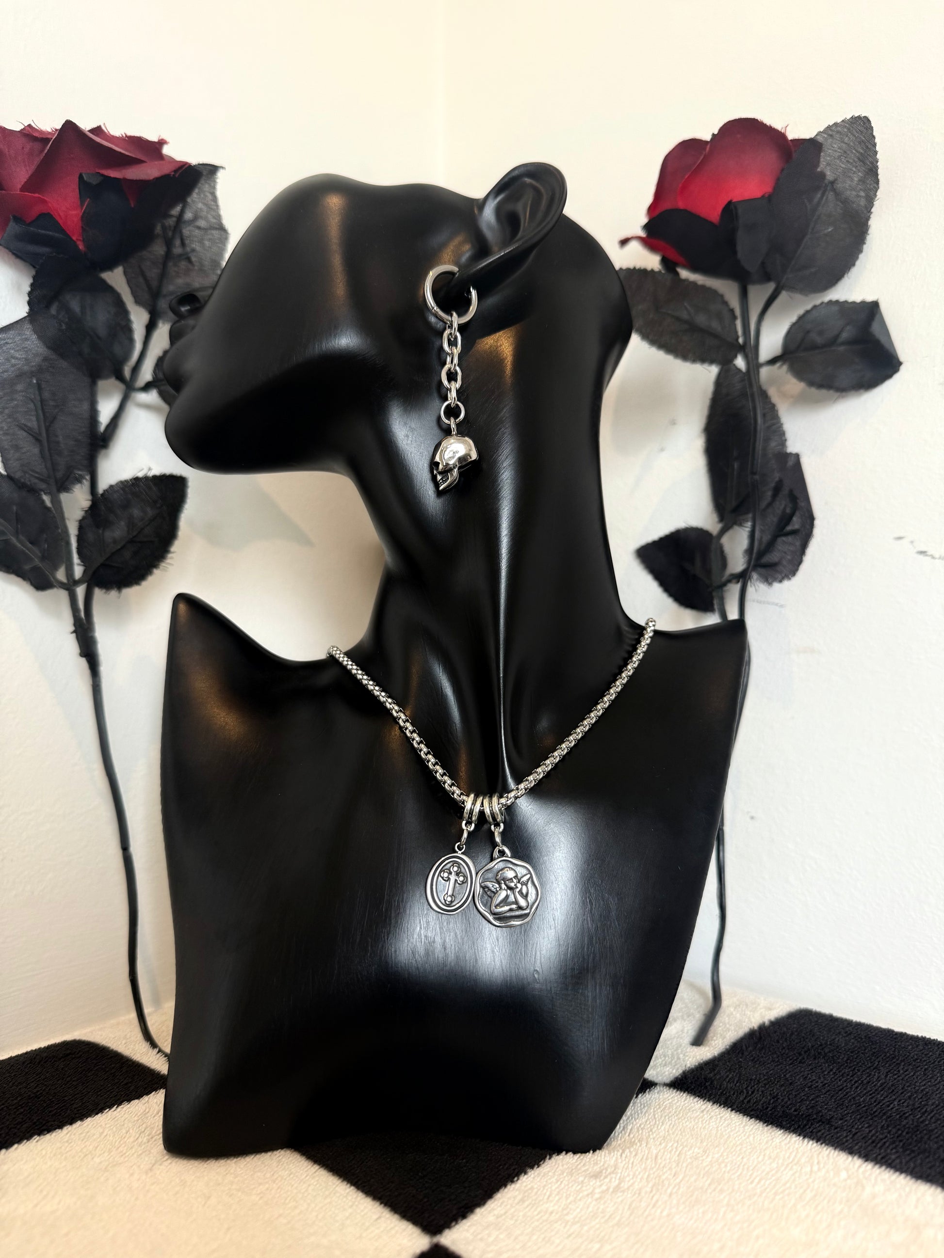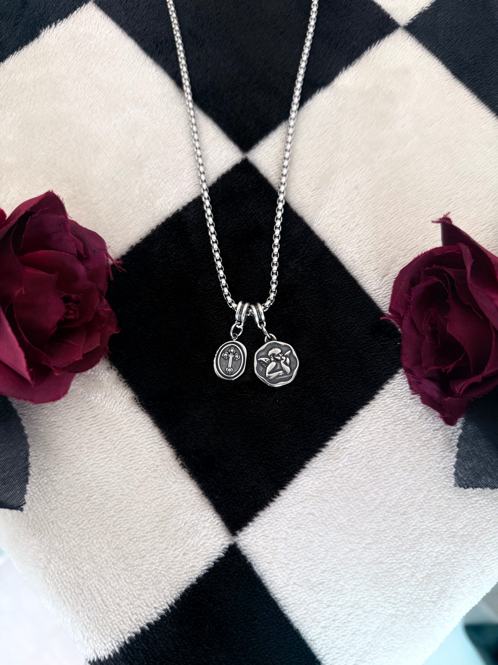 A stainless steel chain featuring twin dime charms: one adorned with a cross, the other with a cherub. Symbolic and stylish, this piece captures the balance of faith and romance, making it a meaningful statement with timeless edge.