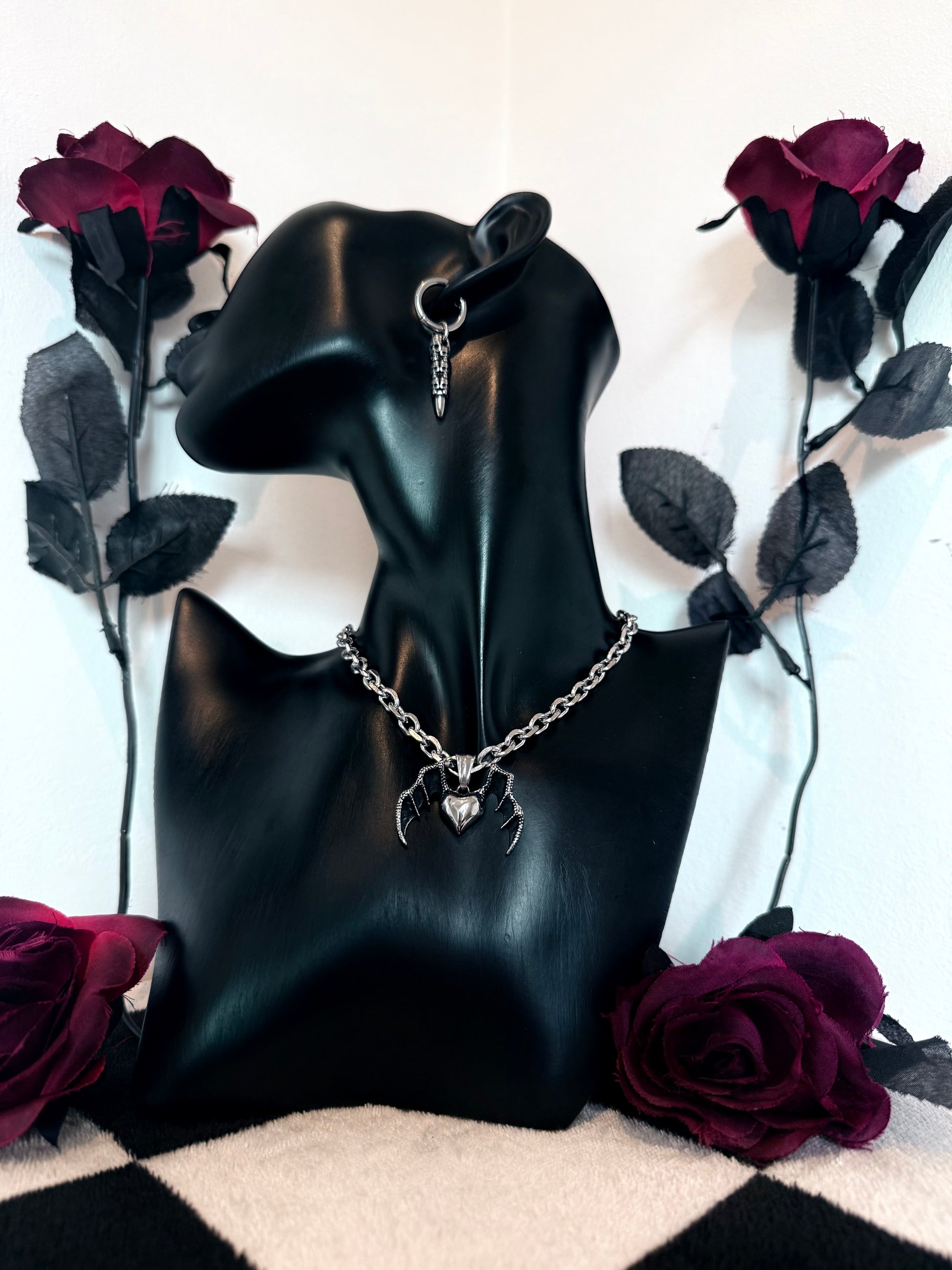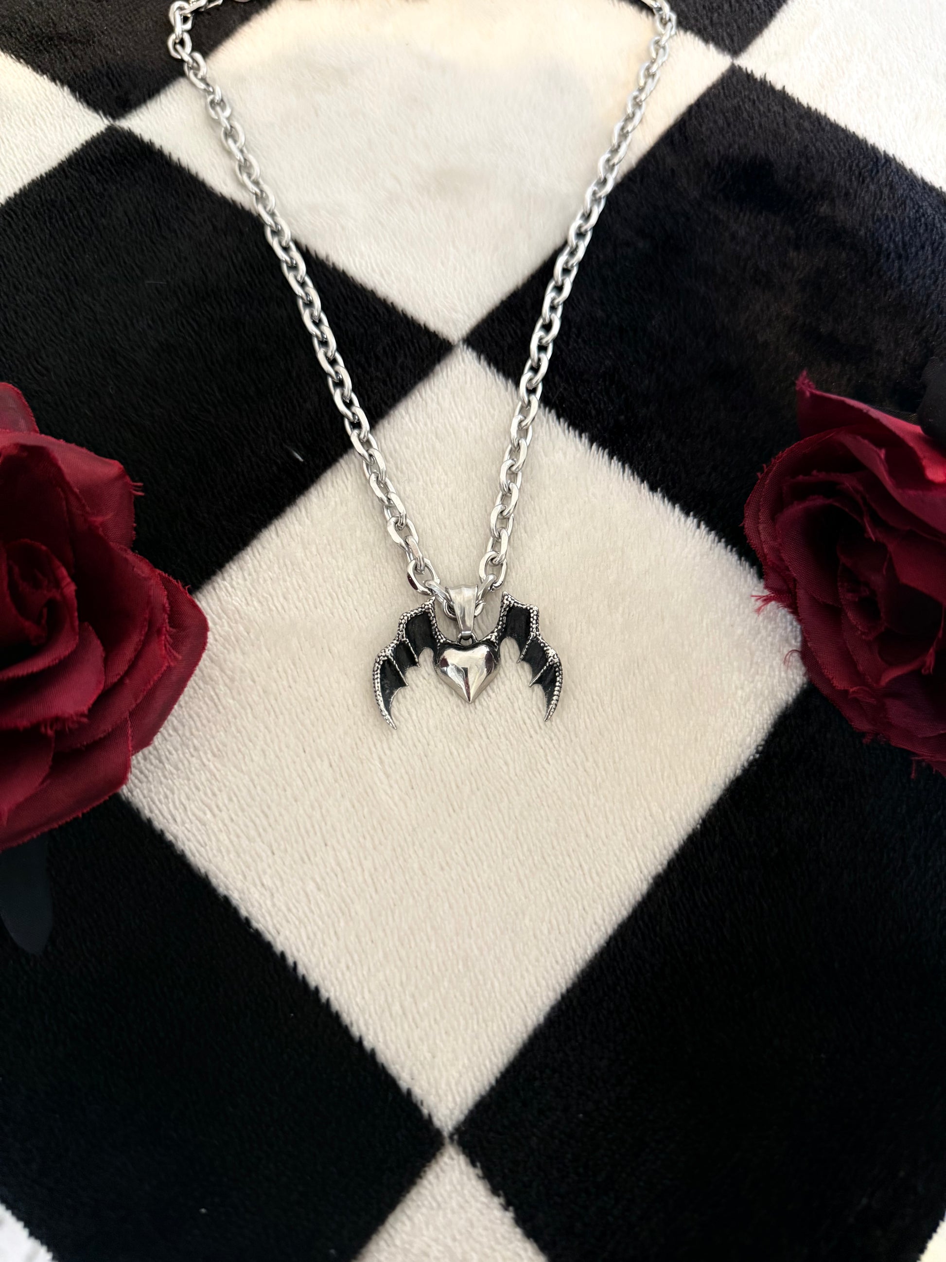 Embrace the dark elegance of the night with this stainless steel chain, featuring a heart-shaped pendant adorned with bat wings. Durable, sleek, and striking, it’s the perfect statement piece for lovers of gothic style and bold accessories.
