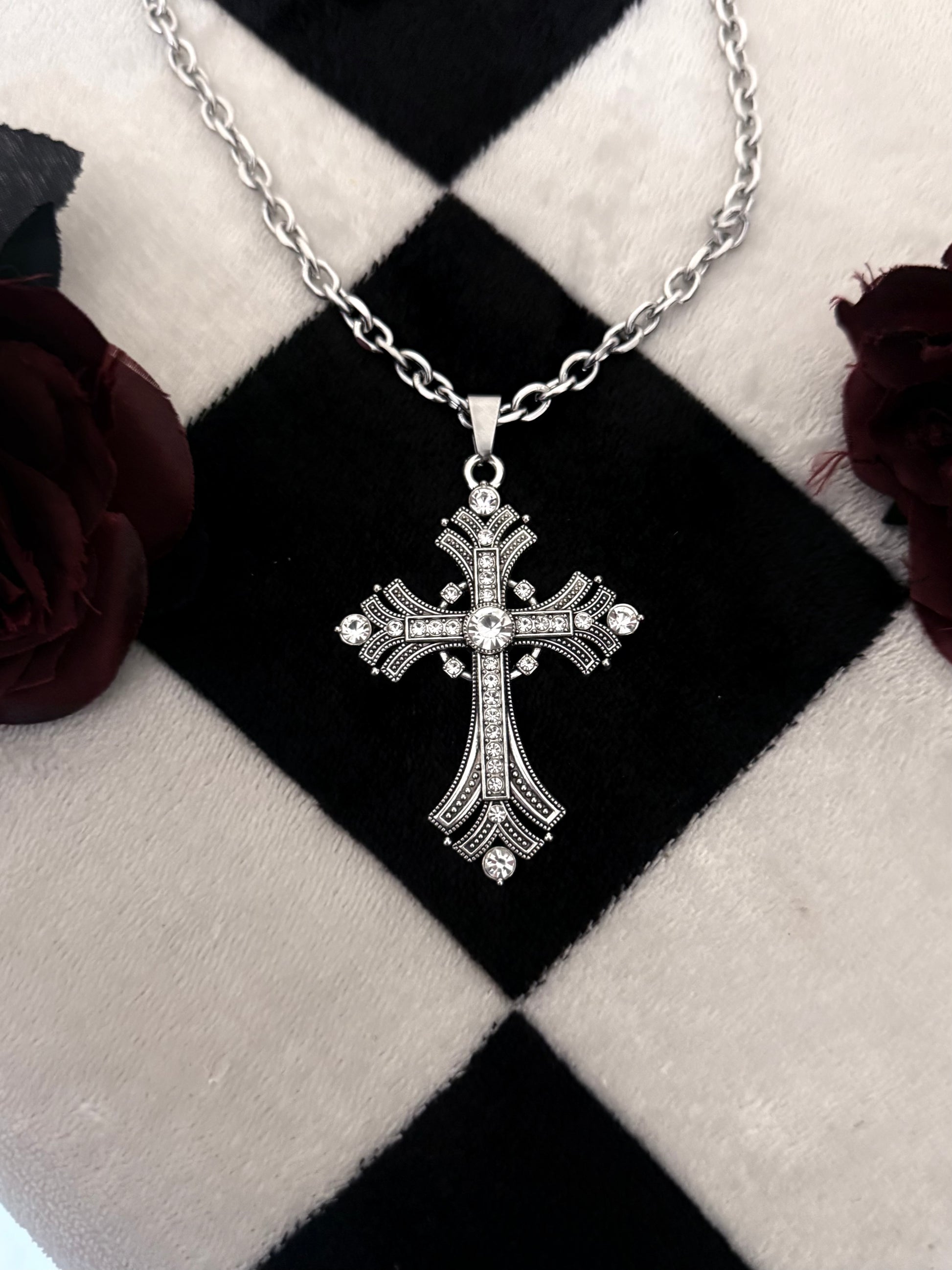 The Phantom Necklace features a stainless steel chain paired with a bold oversized cross pendant, finished with rhinestone detailing. Crafted for durability.