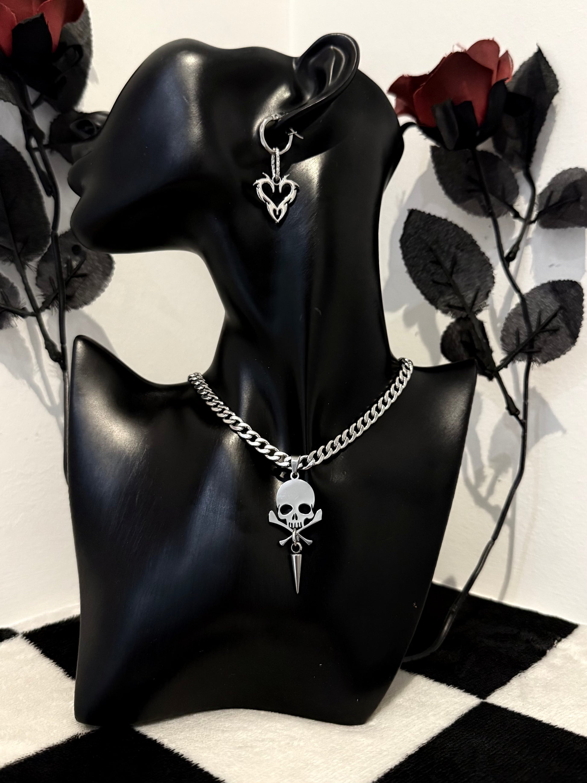The Sinner Necklace makes a statement with a rugged stainless steel curb chain and a bold stainless steel skull and bones charm. A sharp spike dangle hangs from the skull, adding an aggressive edge to the design.