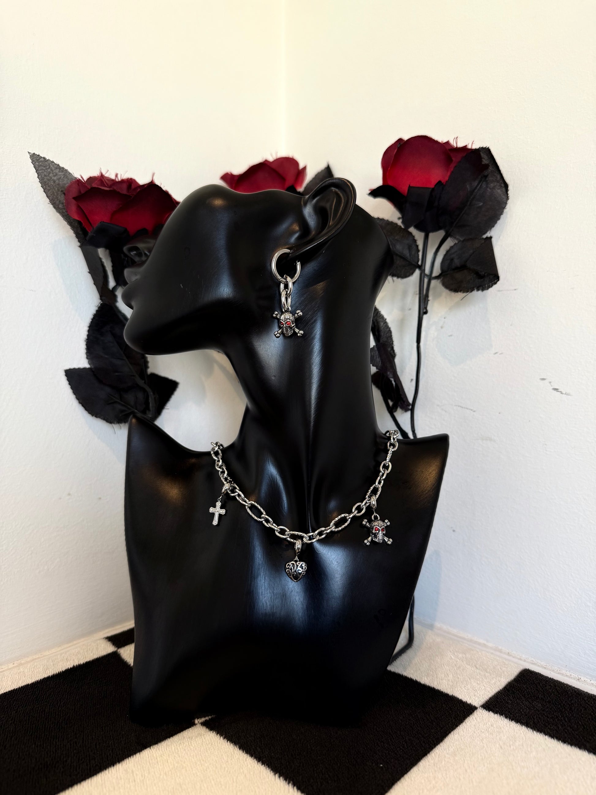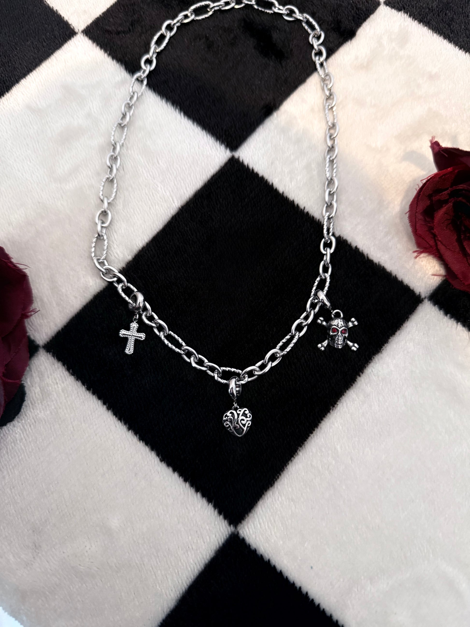 Strike the perfect balance of edgy and elegant. This stainless steel chain features three bold dangle charms, a heart, a cross, and a skull and bones. Durable, eye-catching, and made to stand out.